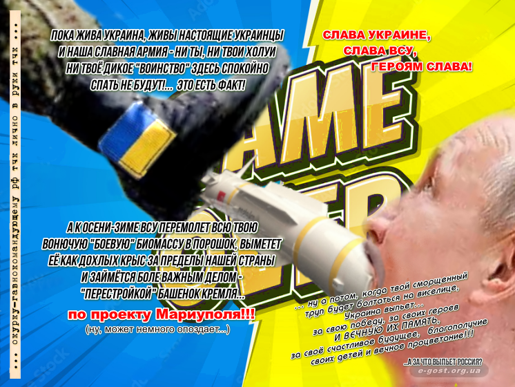 1. Галерея будет пополняться до тех пор пока Украинский Флаг не будет установлен на развалинах кремля! 2. Все картинки в этой галерее носят, как говорил "95 квартал", чисто оскорбительный, открыто издевательский и неприкрыто ненавидящий всю русню, характер. Не поймите нас по-другому... 3. Будем признательны всем IT-волонтёрам (блоггерам, smm- и рекламным специалистам) в "разбрасывании" этих картинок" по интернету, несмотря на п.2. Это наш фронт и наш вклад в победу Украины!
