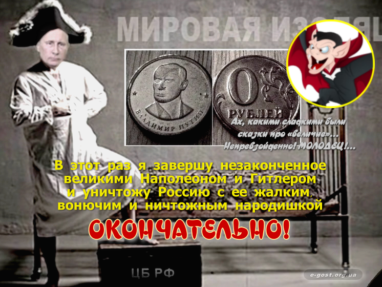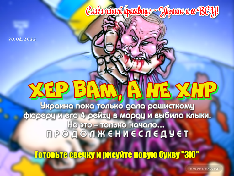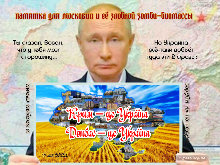 1. Галерея будет пополняться до тех пор пока Украинский Флаг не будет установлен на развалинах кремля! 2. Все картинки в этой галерее носят, как говорил "95 квартал", чисто оскорбительный, открыто издевательский и неприкрыто ненавидящий всю русню, характер. Не поймите нас по-другому... 3. Будем признательны всем IT-волонтёрам (блоггерам, smm- и рекламным специалистам) в "разбрасывании" этих картинок" по интернету, несмотря на п.2. Это наш фронт и наш вклад в победу Украины!