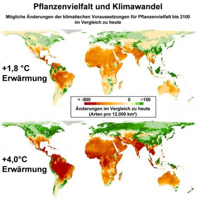 В своей работе авторы составили две карты развития флоры к 2100 году. Одна из них предполагает, что среднемировая температура к тому времени поднимется на 1,8°С, вторая - на четыре градуса. В первом случае картина мира принципиально не изменится. Зато при увеличении температуры на четыре градуса за столетие изменения станут кардинальными.
