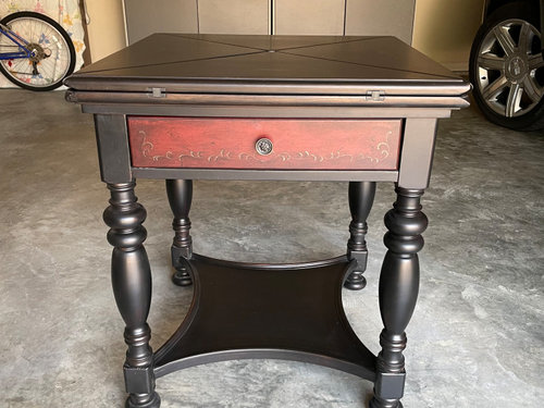I just purchased this preowned game table that folds out and swivels to 39" square. It's by Hooker and very sturdy. I would love any ideas to get rid of the "old world" look. Even thought about having checkerboard square painted in the middle when open. Could lacquer paint be an option??? Also what style chairs would you recommend?