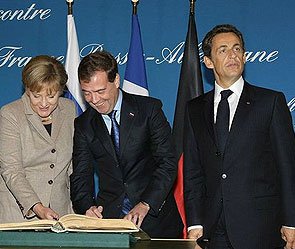 Визовый режим в странах Евросоюза для России будет отменяться в несколько этапов. К такому мнению пришли лидеры крупных стран в ходе саммита Россия-Германия-Франция. В ходе переговоров лидеры "большой тройки" пришли к общему понимаю проблем и призвали Израиль выполнить требования ООН и МАГАТЭ. Дмитрий Медведев, Николя Саркози и Ангела Меркель обговорили вопросы общеевропейской безопасности.