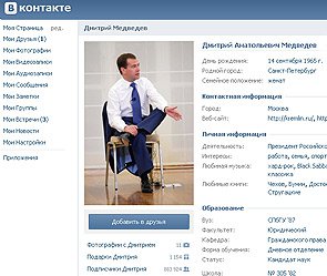 Российский лидер Дмитрий Медведев завел себе личную страничку в популярной российской социальной сети "ВКонтакте". Первыми, кто узнал об этом, стали сторонники российского президента, которыми на сей раз оказались как раз представители сетевых сообществ. Также президент России высказал мнение, что власти должны иметь своих сторонников в сетевых сообществах, чтобы поддерживать современный и актуальный уровни развития.